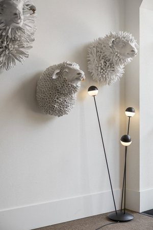 Lampa wewnętrzna, podłogowa Alfi marki Estiluz. Kolekcja lamp Alfi jest oparta na prostych kształtach. Każda z opraw posiada szklane, kuliste klosze w mlecznym wykończeniu. Ich połączenie z kolorami oprawy pozwala na stworzenie eleganckiej, a zarazem nowoczesnej aranżacji w pomieszczeniu.